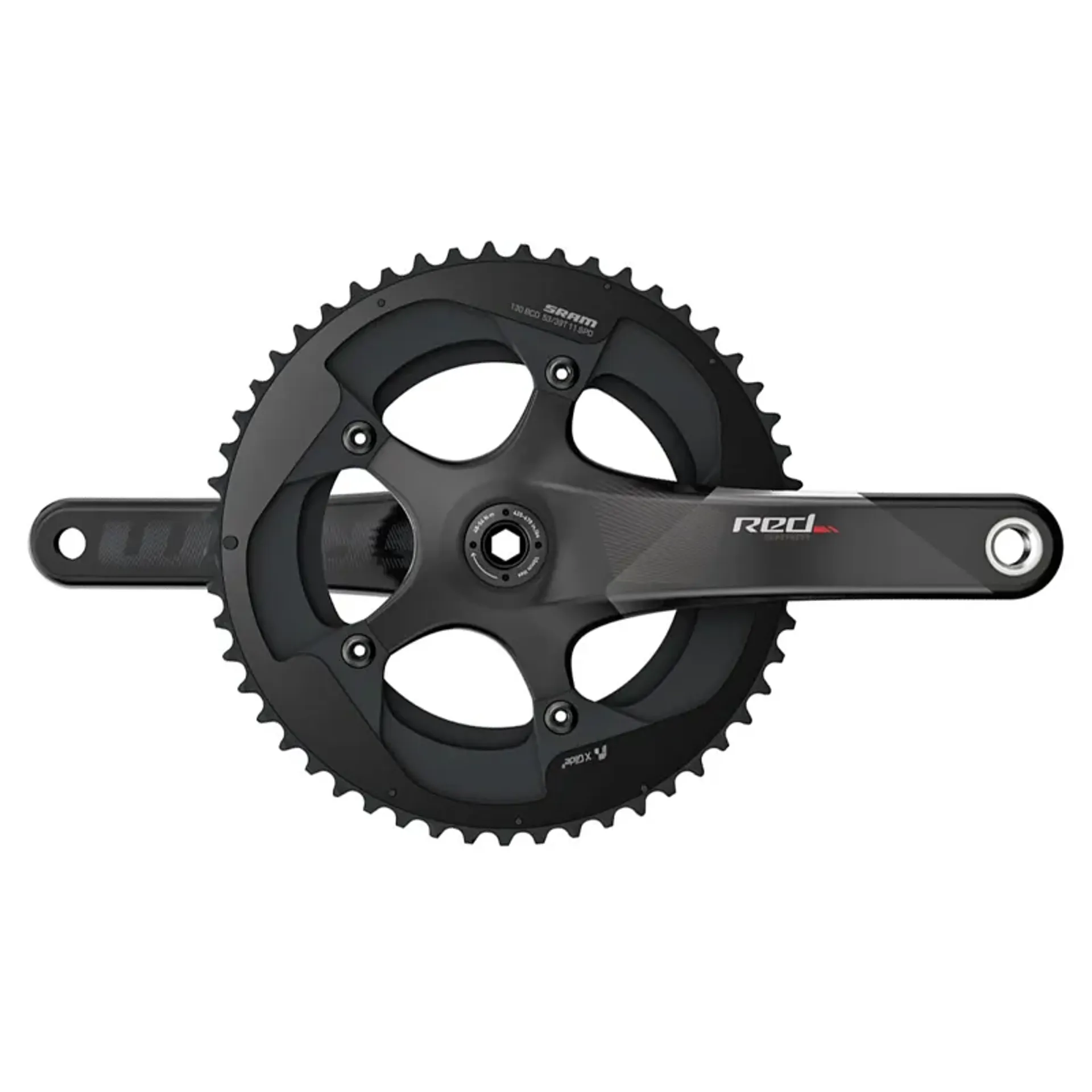 The SRAM Red Exogram crankset features a completely hollow construction all the way to the spider. Its hidden bolt pattern makes better use of carbon fiber to further improve stiffness and shed weight. As always for seamless, flawless performance and Yaw compatibility, pair this crank with X-glider chainrings.